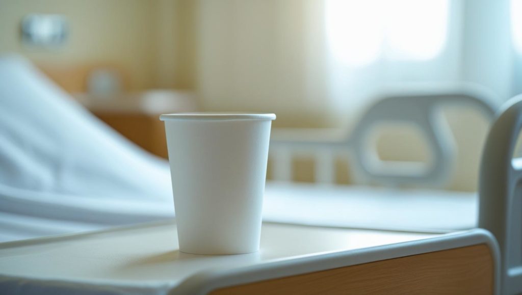 病室に看護師が来てテーブルの上に紙コップを置きました。中を見てみると、何やらピンク色をした液体が入っているではありませんか。