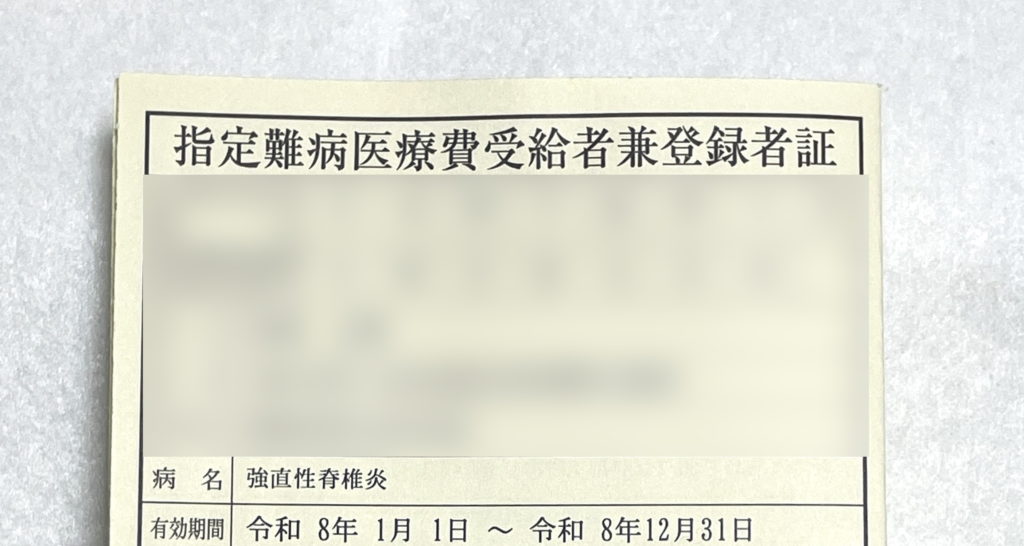 昨年9月に更新申請した強直性脊椎炎の指定難病医療費受給者証において、審査の結果、対象患者として承認されたため今回も受給者証が交付されました。