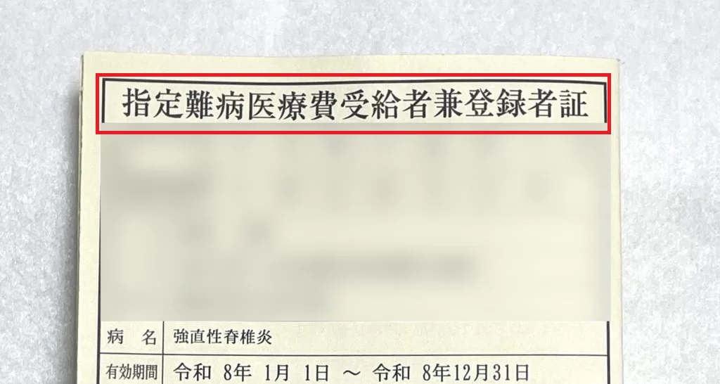 私が昨年に受給者証の支給申請を行う際、登録者証の希望欄にチェックを入れて申請したところ、審査・承認を経て令和8年の受給者証(病名:強直性脊椎炎)が交付されました。
