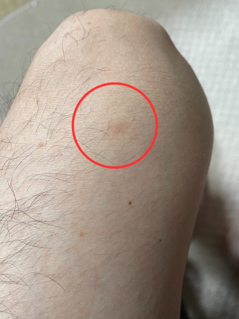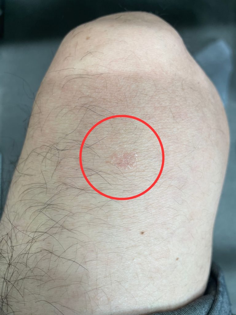 下の写真の赤丸は、ヒュミラ休薬中(退院後)に左ひざ付近にできた乾癬です。直径9㎜ほどで、皮膚の表面がかさぶたのように白く、赤みもあります。通常、ここからさらに乾癬が広がっていきます。